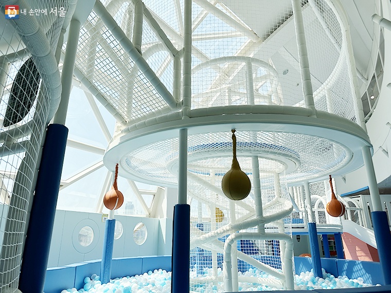 ◆ 넘실넘실, 물결 위로는 한강 위를 걸어 다니는 것처럼 체험을 할 수 있는 그물 놀이터가 설치되어 있습니다. 그리고 길이 17m 규모의 미끄럼틀, 그물 터널과 타워, 볼풀(ball pool), 트램펄린 등이 있어 아이들이 다양하게 놀 수 있고, 대근육과 유연성을 기를 수 있습니다.